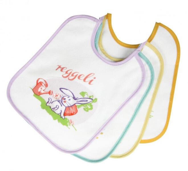 Frottír, 100% pamut anyagú, nyakba köthető előke PEVA hátfallal. Egy csomag 4 db különböző mintájú előkét tartalmaz.