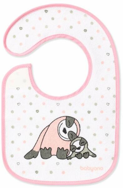 A gyönyörű motívummal ellátott melltartó kiváló minőségű frottír pamutból készült. A belső réteg vízálló anyagból készült, amely ráadásul megvédi a baba ruháját a szennyeződésektől. A kényelmes és praktikus tépőzáras rögzítés növeli a baba komfortérzetét.