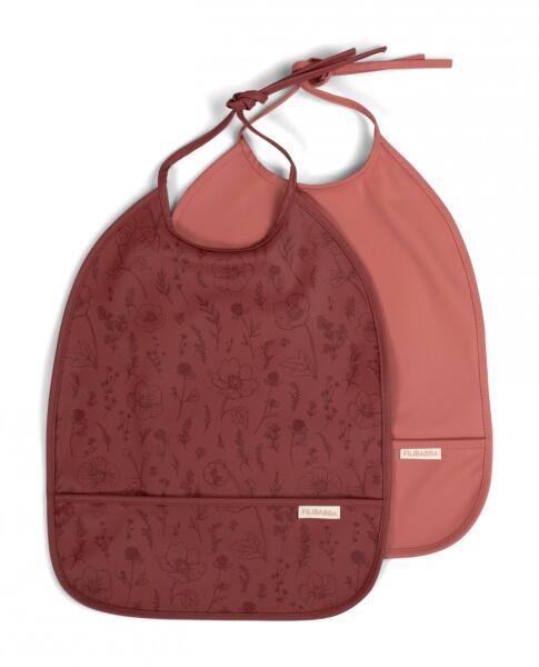Praktikus és gyönyörű előke, amely a nyaknál kötődik, lehetővé teszi a nyak szélességének beállítását. Alul egy zsebbel tervezték, amely képes összegyűjteni a kiömlött ételt és folyadékot, vagy használható egy kanál vagy egy nedves törlőkendő tárolására útközben. Az előke poliészterből készült, puha PU bevonattal, amely kényelmes viseletet és vízállóságot tesz lehetővé. Az előke könnyen áttörölhető egy nedves ruhával, és mosógépben 30 fokon mosható. A csomag tartalmaz egy egyszínű, Brick dust színű előke és egy őszi virágok felirattal mintázott, legszebb árokszéli virágokat.